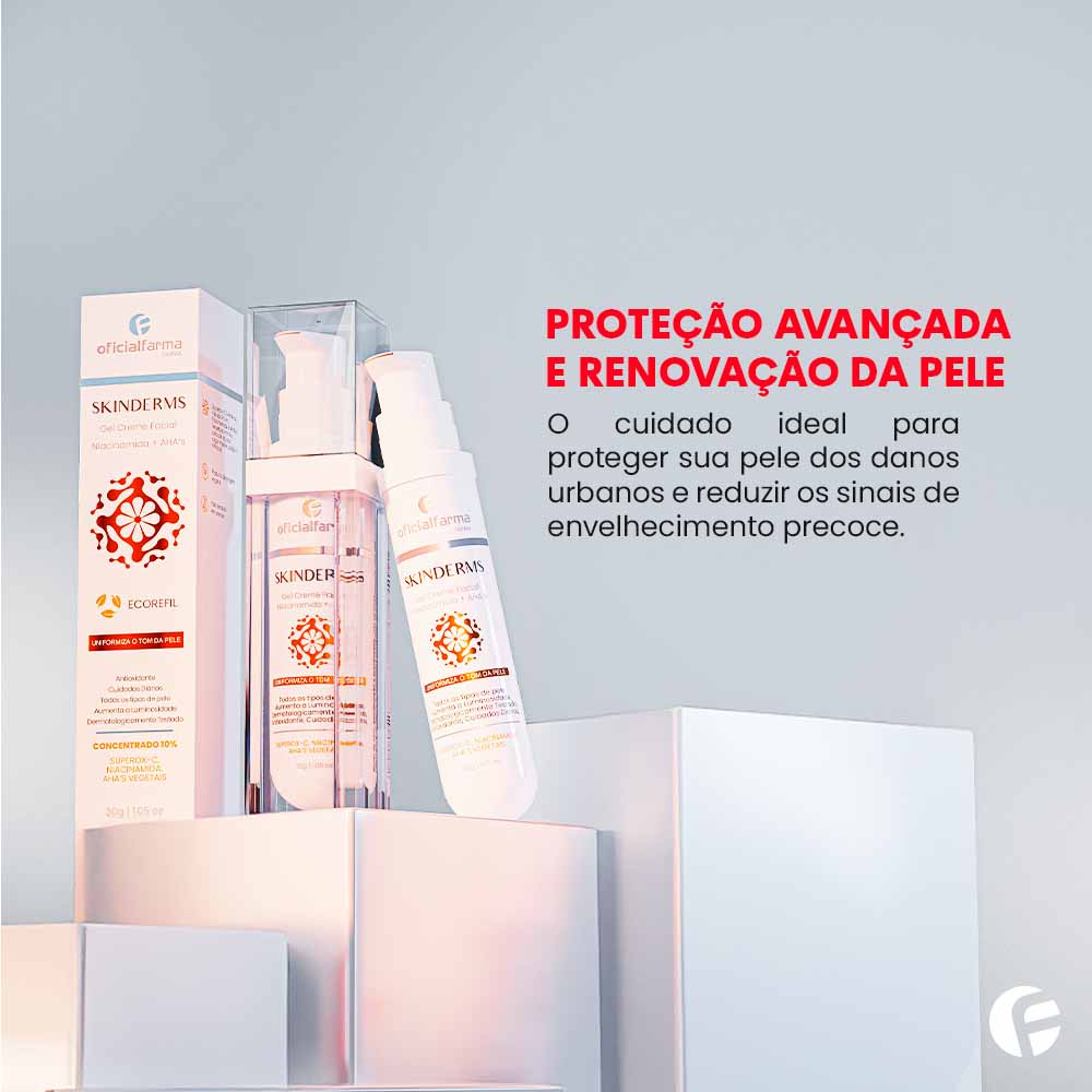 Formulado para combater os sinais de envelhecimento e proteger a pele das agressões urbanas, o Skinderms Gel Creme combina a poderosa ação antioxidante da Vitamina C com Niacinamida (B3) e ácidos vegetais (AHAs). Uma solução completa que preserva o colágeno, reduz o estresse oxidativo e uniformiza o tom da pele.